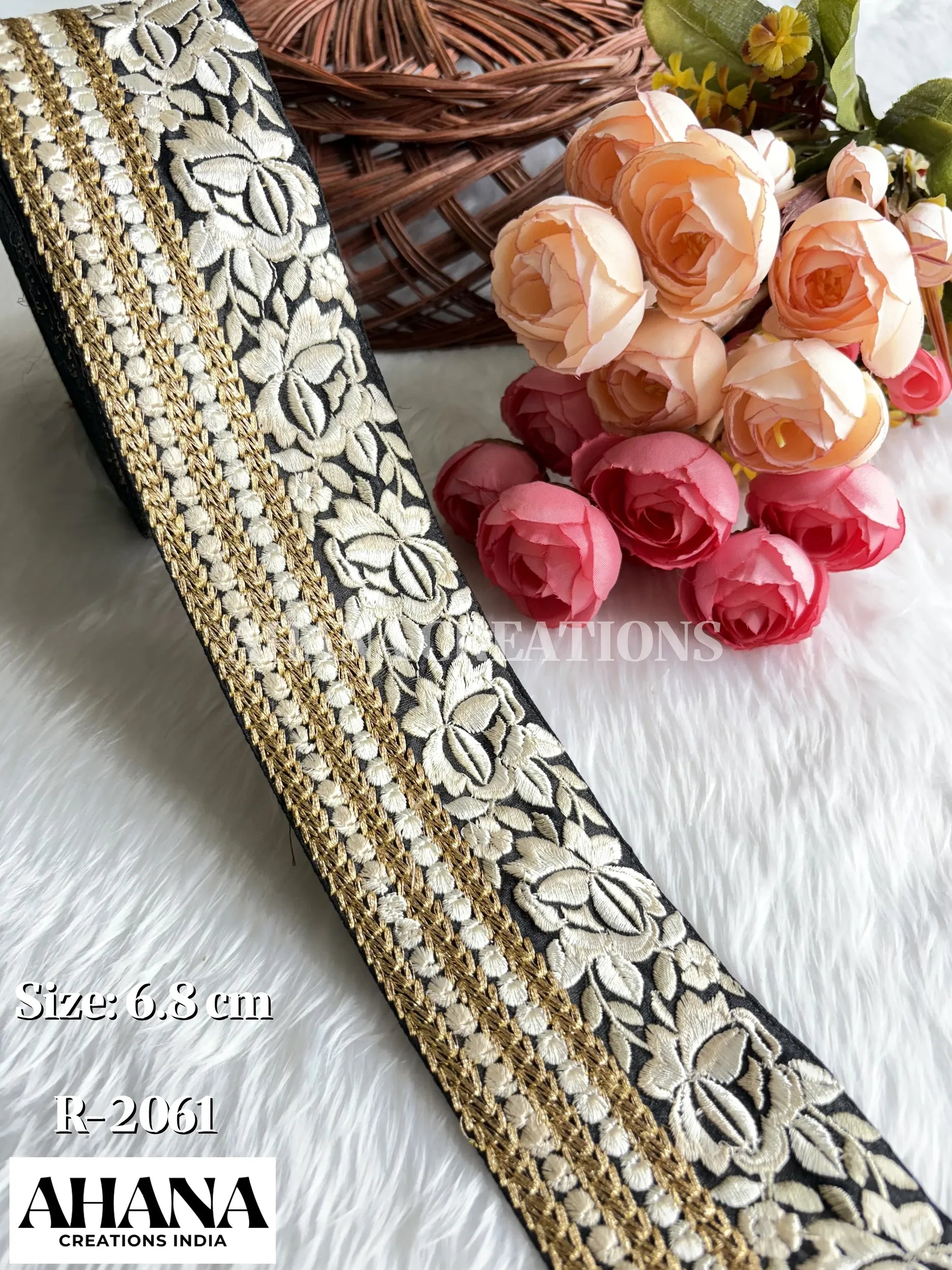 Upgrade your creations with Naya Dupion Dual Tone Lace - Black base with Zari and resham work – featuring rich Black Dupion and a width of 6.8 cm, perfect for intricate border work. Adorned with carefully detailed Zari and resham work for traditional charm.