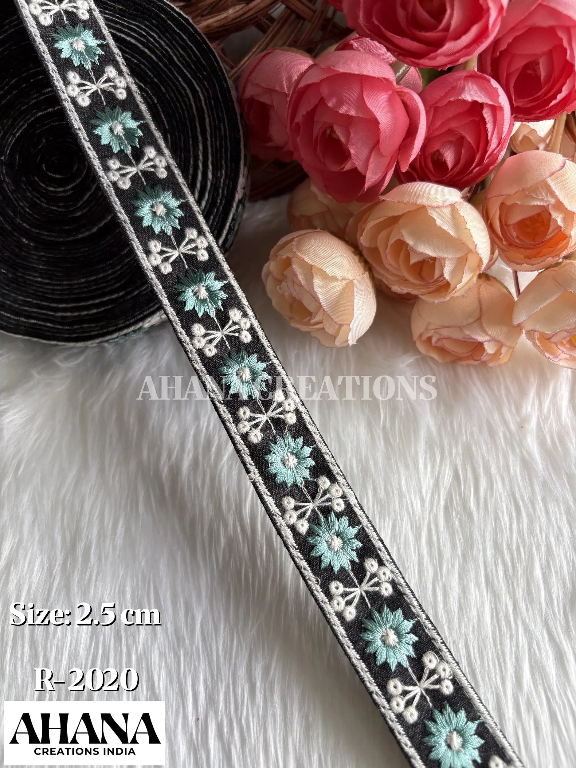 Introducing Siya Dupion Dual tone lace - Black base with Aqua floral and white thread work – a detailed lace on luxurious Black Dupion, perfectly sized at 2.5 cm for versatile ethnic wear projects. Intricate Aqua floral and white thread work work gives it a distinct designer appeal.